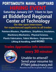 January 24, 2026 When January 24, 2026 10:00 am - 2:00 pm Add To Calendar Download ICS Google Calendar iCalendar Office 365 Outlook Live Where Biddeford Regional Center of Technology 10 Maplewood Ave, Biddeford, ME, 04005 Map Unavailable Portsmouth Naval Shipyard HIRING EVENT Saturday, January 24th 10am to 2pm at Biddeford Regional Center of Technology On-the-spot interviews for experienced applicants in all trades Painters/Blasters, Pipefitters, Shipfitters, Insulators, Machinery Mechanics, Physical Science, Plastic Fabricators, Fabric Workers, Engineering, Lifting & Handling and MORE! Trades Apprentice info sessions every 30 minutes! Unable to attend? Send your resume to PTNH-jobs@navy.mil Resumes must be no greater than 2 pages